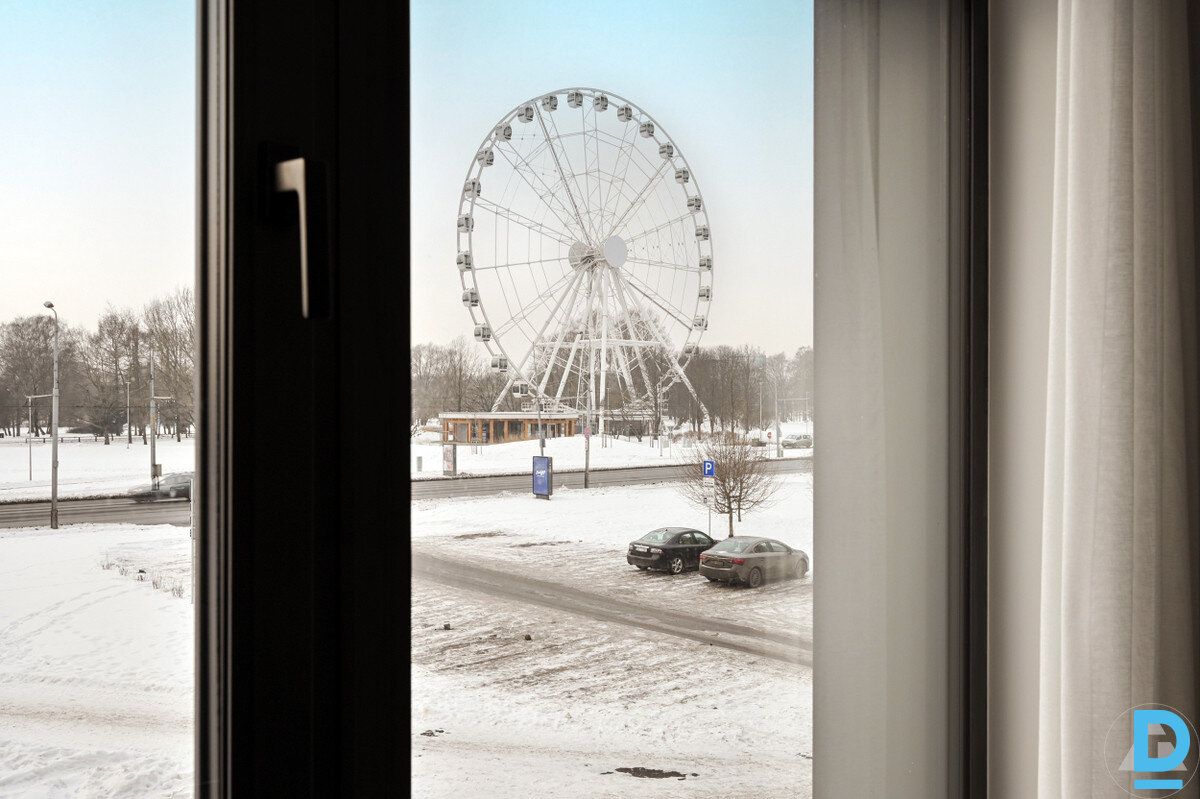 Pārdodu pilnībā aprīkotu, Premium klases dzīvokli jaunajā projektā “Nameja Rezidence” — pa logu paveras skats uz jauno Rīgas panorāmas ratu.