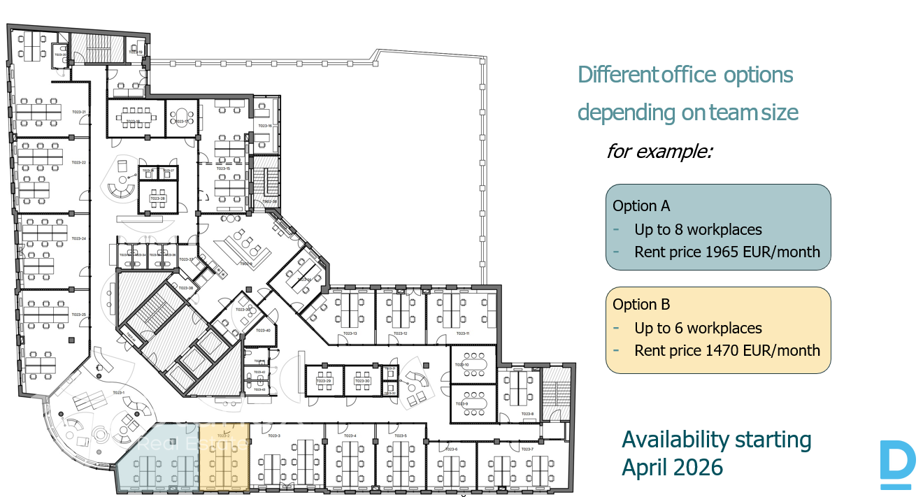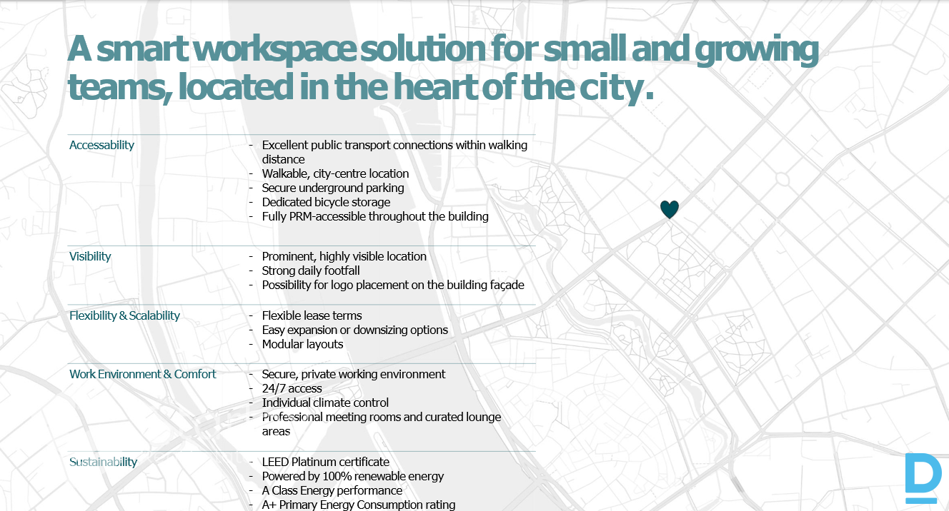 | Iznomā mēbelētas un pilnībā aprīkotas A klases biroja telpas modernā biroju ēkā "Valdemāra Centrs" ekskluzīvā darījumu centra vietā - uz Krišjāņa Valdemāra un Elizabetes ielas stūra, dažu minūšu gājienu attālumā no Vecrīgas, prestižā jūgendstila ēku rajonā, kas ir iekļauta pasaules "UNESCO" pasaules kultūras mantojuma sarakstā. Ēkā atrodas tādi atpazīstami nomnieki kā "Workland Latvia", "SORAINEN", "WEB Help", "DPA", "Oracle Corporation", "PwC", "Tavelport", "SQUALIO", ēkas 1. stāvā izvietoti tādi nomnieki kā "Narvesen", "Rimi Express", "Costa Coffee", "Kolonna". Konkrētais piedāvājums - pilnībā aprīkots 6 darba vietu birojs ēkas 2. stāvā. Piedāvājam: Pieejams sākot no 2026. gada aprīļa, šobrīd notiek biroja izbūve. Privātu un pilnībā mēbelētu biroju. Piedāvājumā biroji no 4-14 darba vietām. Nomniekiem tiek nodrošināta piekļuve arī pilnībā aprīkotām pārrunu telpām. Stilīgas lounge zonas un modernas un aprīkotas koplietošanas virtuves zonas. Daudzfunkcionālas pasākumu un viesu telpas. Aprīkota bērnu istaba Āra terase Iespēja nomāt apsargājamu stāvvietu zem ēkas. Pieejama velosipēdu novietne. 1. stāvā pie ēkas galvenās ieejas zonas 2026. gada pavasarī tiks atvērta kafejnīca. Apkārtnē labi attīstīta sabiedriskā transporta infrastruktūra. Atpazīstama labi redzama ēka Elizabetes/Kr. Valdemāra ielas krustojumā, uzņēmuma logo izvietošanas iespēja uz ēkas fasādes. Elastīgi līguma nosacījumi no 6-12 mēnešiem. 24/7 piekļuve biroja telpām. Individuāla klimata kontrole darba telpās. Vienkāršas nepieciešamo darba telpu paplašināšanas vai samazināšanas iespējas. Pie 100% telpu aizpildījuma biroja izmaksas uz 1 darba vietu ne lielākas par 300 €/mēnesī. Ēkai ir LEED Platinum sertifikāts. A klases energoefektivitāte. A+ primārās enerģijas patēriņa novērtējums. Nomas maksa: 1470 €/mēnesī + apsaimniekošanas maksa + komunālie maksājumi + PVN. | |