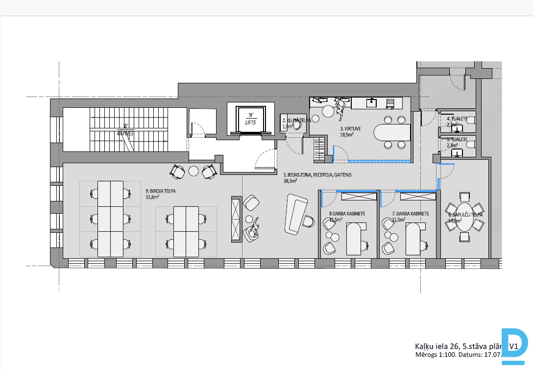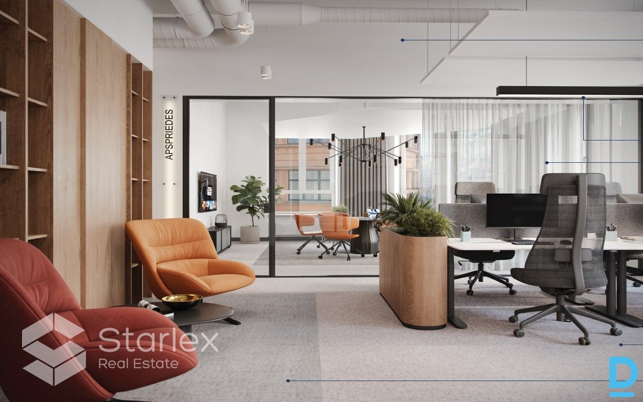 | Class A premises for rent in a reconstructed building in Old Riga, Kaļķu Street 26. Currently, reconstruction work is underway in the building, during the process, the office space can be adapted to the tenant's needs, the necessary layout can be developed, etc. The offices will be available after reconstruction from autumn 2025. The premises have a high-level industrial-style finish with exposed ceiling communications, separated meeting rooms with glass partitions (aluminum frame and tempered glass), Tarkett carpet tiles, high-level plumbing in the sanitary facilities and well-equipped kitchen corners. The premises have centralized air ventilation and cooling systems with the ability to adjust individually to the tenant's needs. We offer for rent a 146 m² office on the 5th floor. The layout is adaptable to the tenant's needs. The 1st floor is intended for commercial purposes and is currently rented out for a café and souvenir shop. The building will be equipped with video surveillance (in common areas and elevators), fire alarm, and card system access to the building and office spaces. Rental fee: 15.5 €/m² + 2.5 €/m² management fee + utility bills + VAT 21%. | |