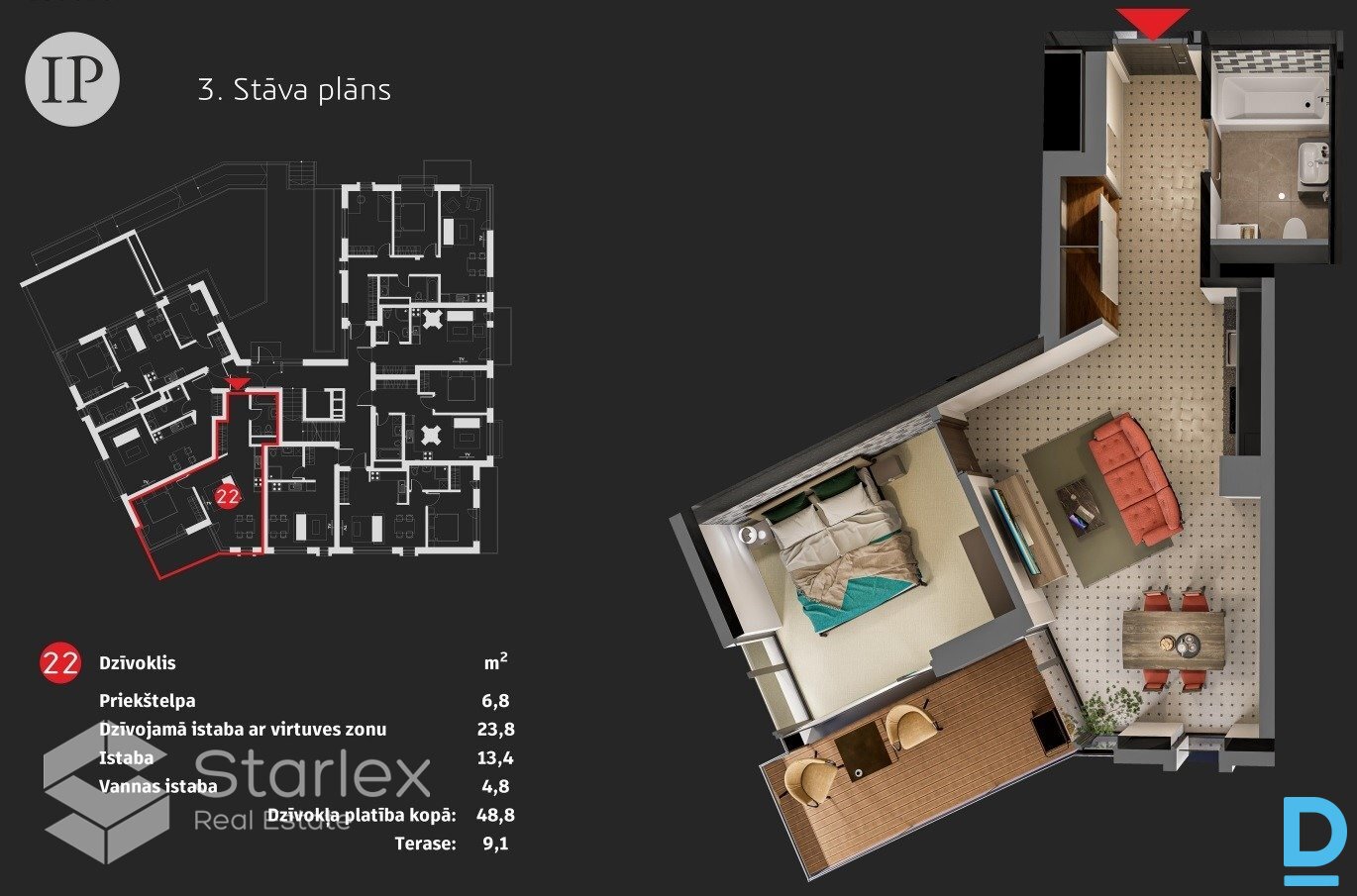| Pieejami ekskluzīvi dzīvokļi unikālā projektā Island Park, Zaķusalā! A klases energoefektivitātes jaunbūve ar 24 dzīvokļiem, 1-3 istabu, platībās 28-82 m². Katrs no dzīvokļiem dod unikālu iespēju apvienot zaļu un mierīgu dzīvi, vienlaikus atrodoties pašā Rīgas sirdī, vien 50 m no Daugavas, ar lielisku skatu uz Vecrīgu. Ēkā ir lifts, pieejamas gan pazemes, gan virszemes autostāvvietas, mantu glabātuves, plašas terases un balkoni. Island Park dzīvokļi pārdodas ar augstākās kvalitātes pilnu apdari. 3. stāva dzīvokļu īpašniekiem ir iespēja izbūvēt jumta terasi. Tieši šis ir plašs divistabu dzīvoklis. Ir 9.1 m² terase uz, kuru var iziet gan no viesistabam, gan no izolētās guļamistabas. | |
