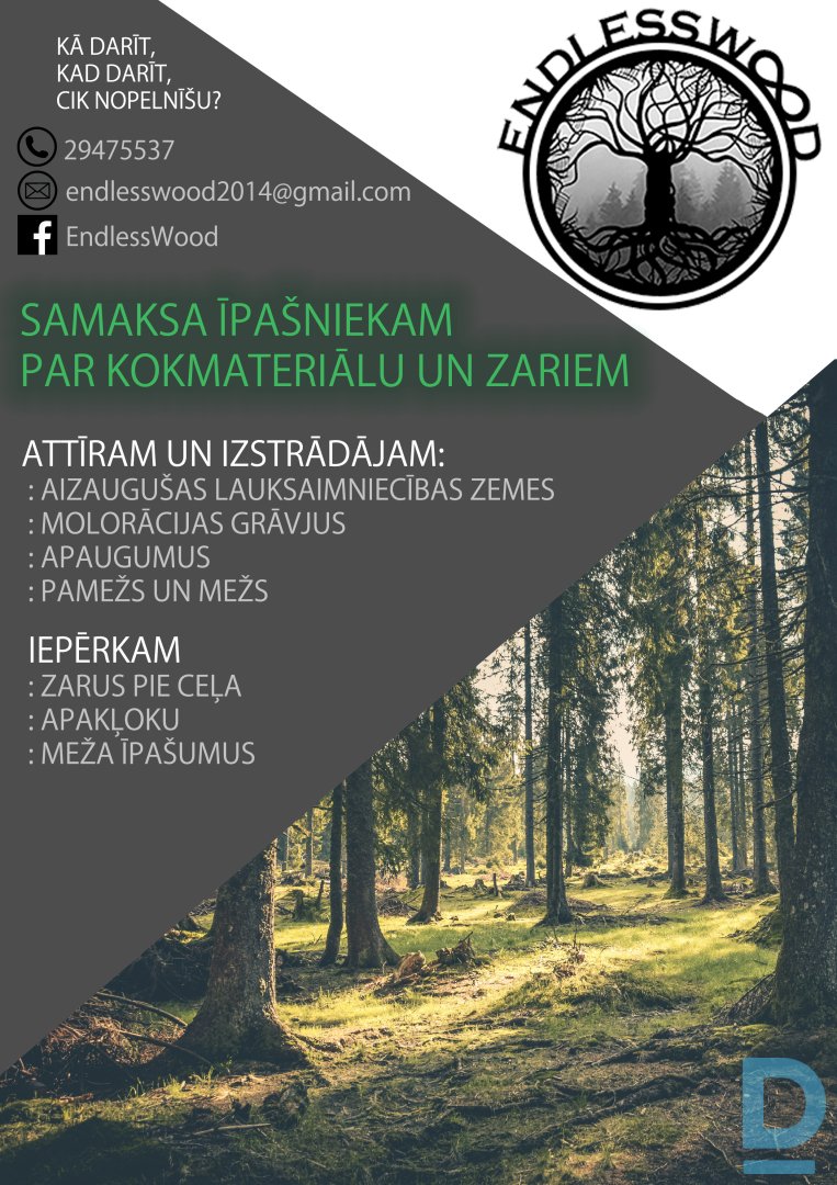 PIEMAKSA ĪPAŠNIEKA PAR KOKMATERIĀLU UN ZARIEM DARBOJAMIES 150KM AP RĪGU ATTĪRAM UN IZSTRĀDĀJAM: - AIZAUGUŠAS LAUKSAIMNIECĪBAS ZEMES - MELORĀCIJAS GRĀVJUS - APAUGUMUS - PAMEŽU UN MEŽU IEPĒRKAM: - ZARUS PIE CEĻA - APAĻKOKU - MEŽA ĪPAŠUMUS |